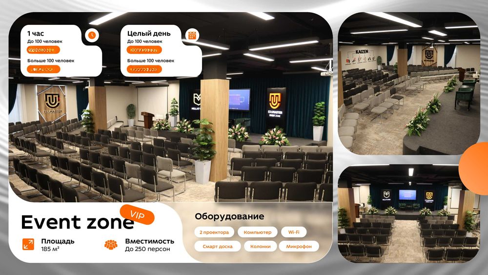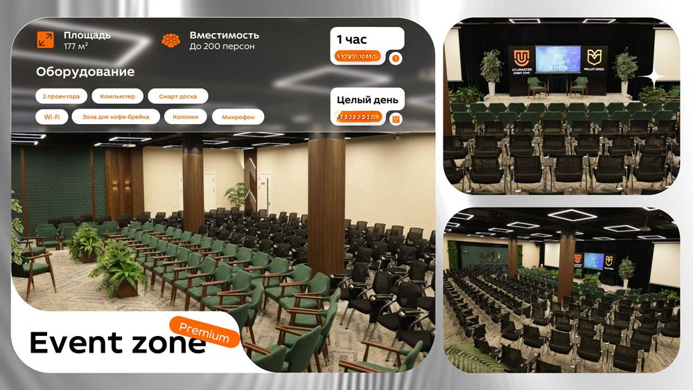 Премиум конференц-залы в аренду | Идеально для ваших мероприятий! Ищете идеальное место для вашего мероприятия? Предлагаем конференц-залы премиум-класса в аренду для проведения: - Конференций - Семинаров - Тренингов - Презентаций и деловых встреч Что включено в стоимость аренды? - Просторные залы с современной мебелью - Сопровождение администратора (без регистрации гостей) - Высокоскоростной Wi-Fi - Флипчарт/доска для записей - Проектор и экран - Кулер с водой - Удобная парковка Программа лояльности для постоянных клиентов! Дополнительные услуги: - Фото- и видеосъемка мероприятий - Микрофоны и звуковое оборудование - Регистрация гостей администрацией - Организация кофе-брейков, обедов и фуршетов Адрес: Ташкент, Чиланзарский район, ул. Бунёдкор шох, Дом 3А Ориентир: метро Новза, напротив мечети Забронируйте прямо сейчас! +99878 113 48 08 | +99877 006 11 00