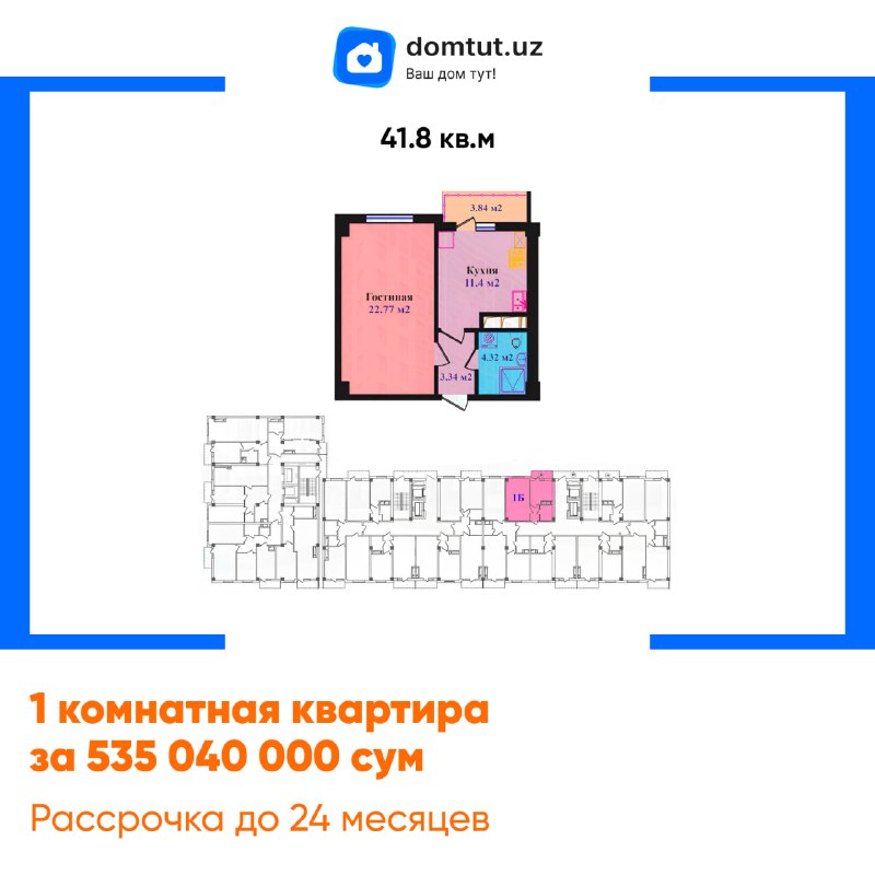 🏢1 комнатная квартира в жилом комплексе - комфорт класса!📍Адрес: Яшнабадский район, улица Фаргона йули 15/12💵 Цена за : 538 040 000 сум {44.402} Рассрочка до 24 месяцев Площадь: 41.8